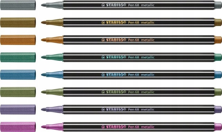 Flamastry dostępne w 8 kolorach metalicznych: złoty, srebrny, miedziany, zielony i niebieski zielony jasny, fioletowy i różowy.